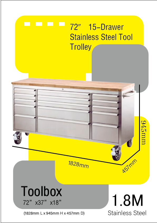 72" 1.8M 15 Drawers Stainless Steel Cabinet Toolbox Tool Box Storage Trolley